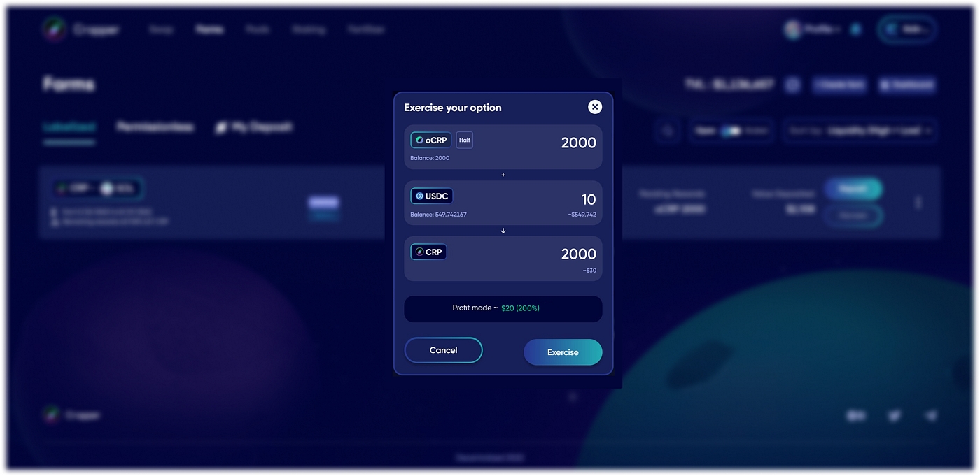 In the example shown above, you can see the user has 2000 $oCRP to be exercised which will allow them to buy $CRP at a price of 0.005 $USDC/$CRP. By exercising this option, the user will receive 2000 $CRP for the value of 30 $USDC in exchange for 2000 $oCRP and 10 $USDC. That means making a profit of 200%.