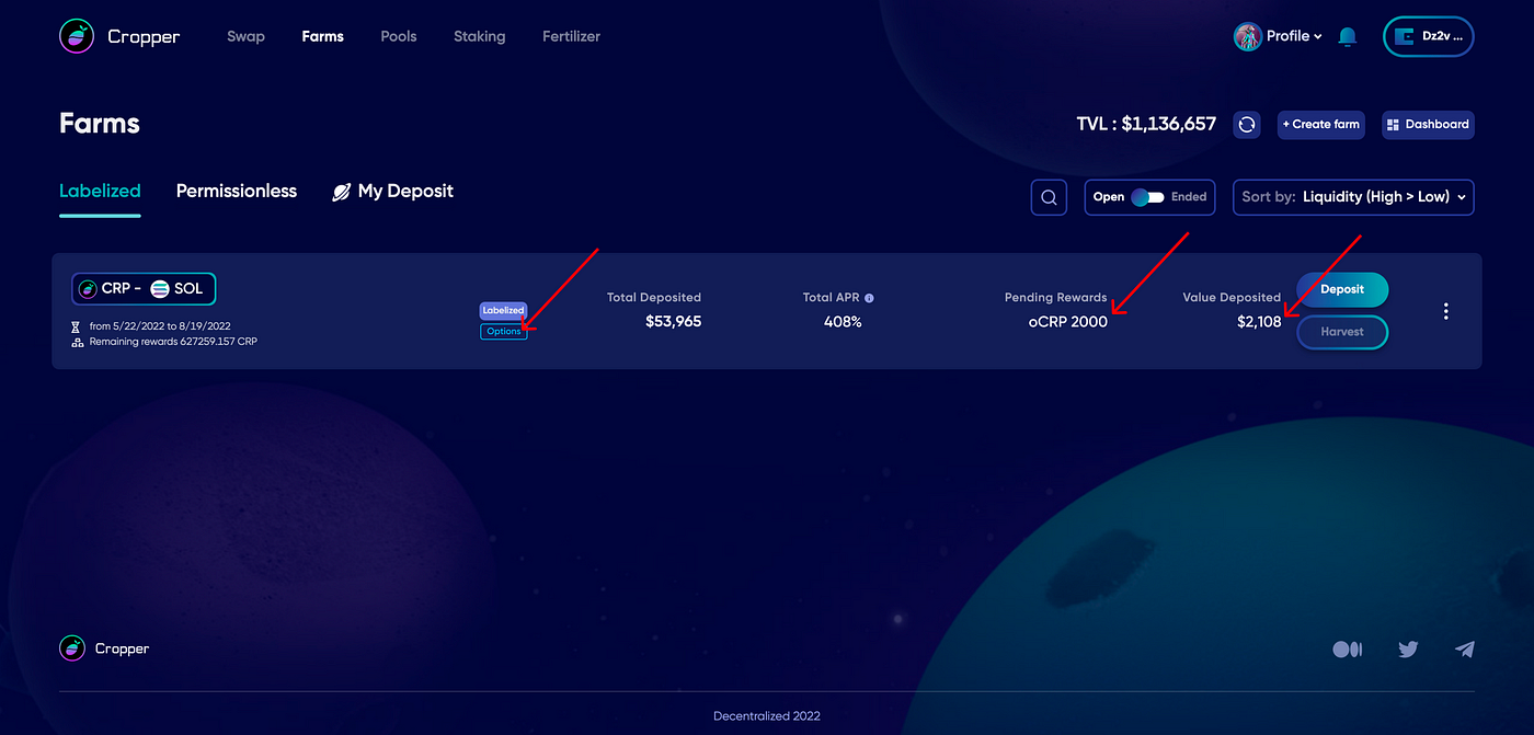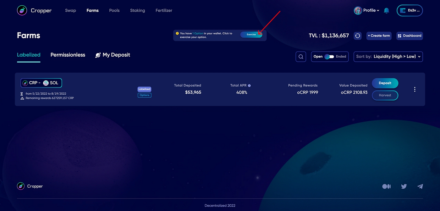 Once you’ve claimed your $oCROP (option CRP), a banner will appear at the top of the page showing that you have an option to be exercised, as indicated below.